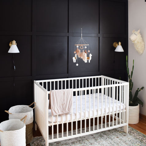 A dramatic black grid wall made all the difference in this nursery by creating the look of a larger space. The room is balanced with old and new pieces and is riddled with llamas and alpacas for cozy vibes.